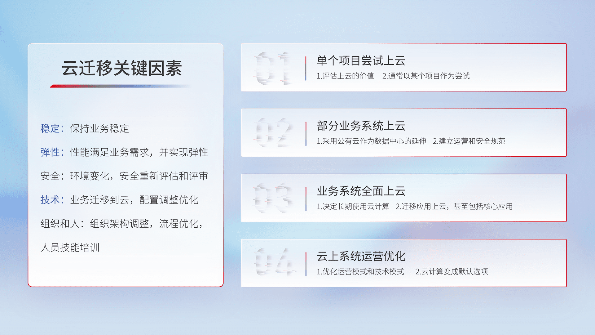 结合实际业务,,,,从规划设计、、、云平台选型、、云原生改造、、数据迁移、、集成交付,,迁移全过程为客户识别最佳上云路径,,做好风险识别管理,,,,设计网络架构、、身份权限、、、安全审计合规、、、、操作审计、、日志审计、、、监控告警策略、、、多站点容灾设计等,,对云上基础设施进行整体规划,,,提升IT治理水平,,,以满足弹性、、、、高可用、、、、高性能的需求。。。。